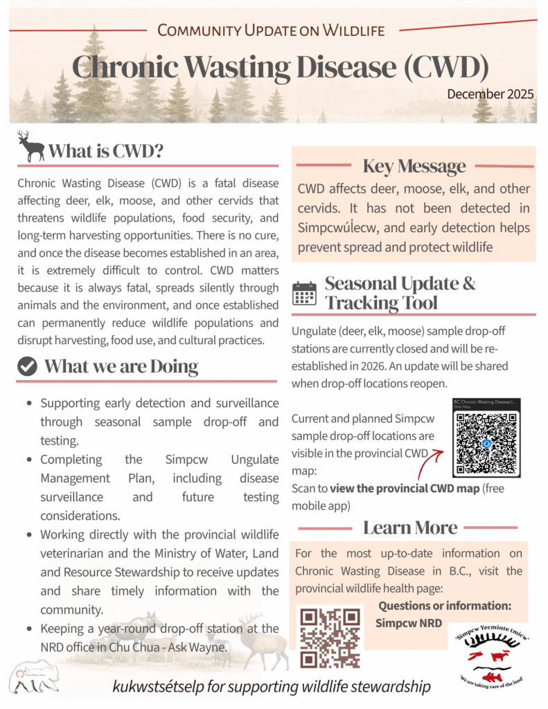 CWD is a fatal disease that affects deer, elk, moose, and other cervids. While it has not been detected in Simpcwúl̓ecw, early detection is critical to protecting wildlife, harvesting practices, and long-term food security.