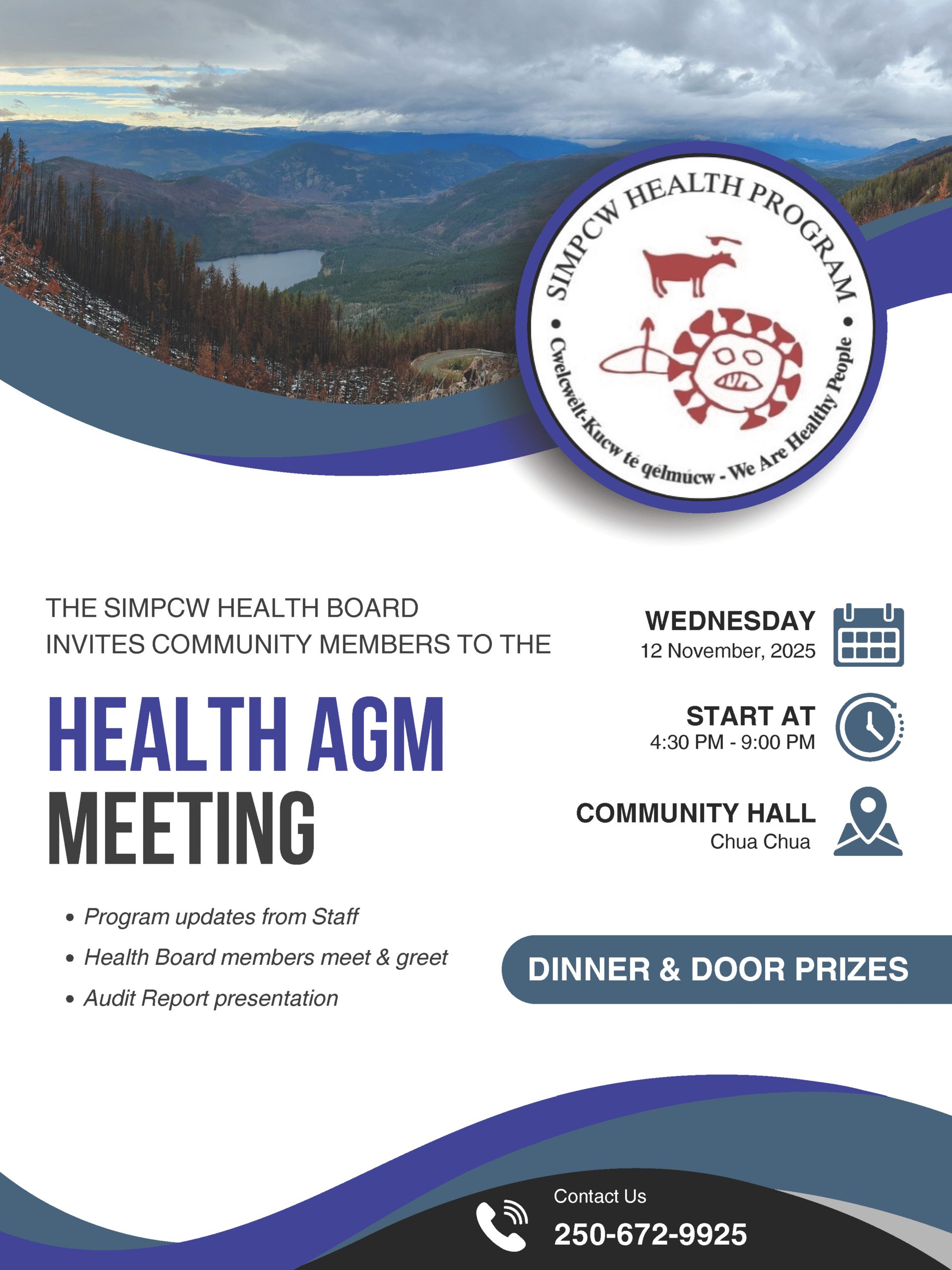 The Simpcw Health Board invites all community members to come out for an evening of connection, updates, and good food.