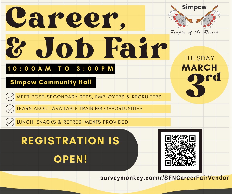 Simpcw is hosting a Career & Job Fair on Tuesday, March 3rd, from 10:00 AM–3:00 PM at the Community Hall.
