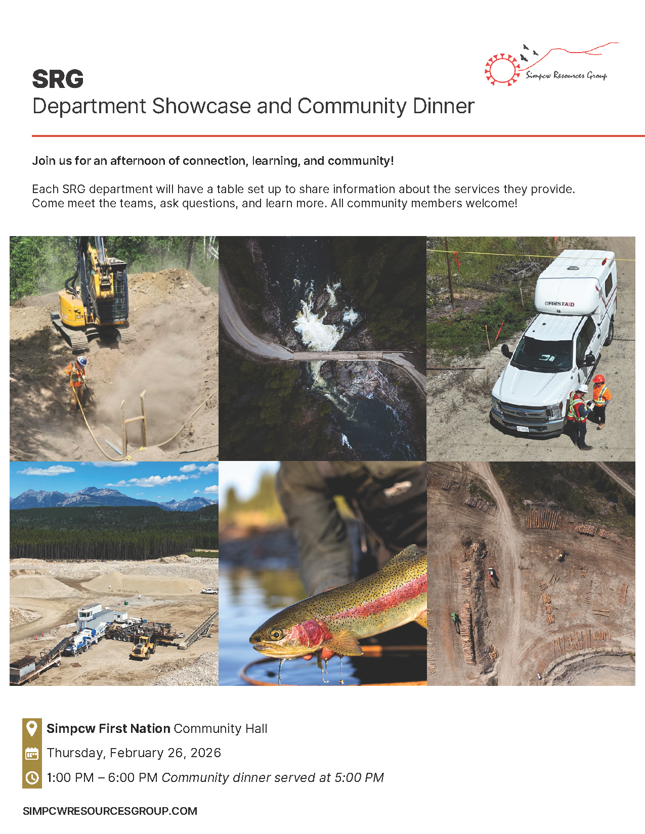 Simpcw Resources Group is hosting a Department Showcase & Community Dinner, where each SRG department will be set up to share information about the work they do and the services they provide. Come meet the teams, ask questions, and learn more about whatโs happening across SRG.