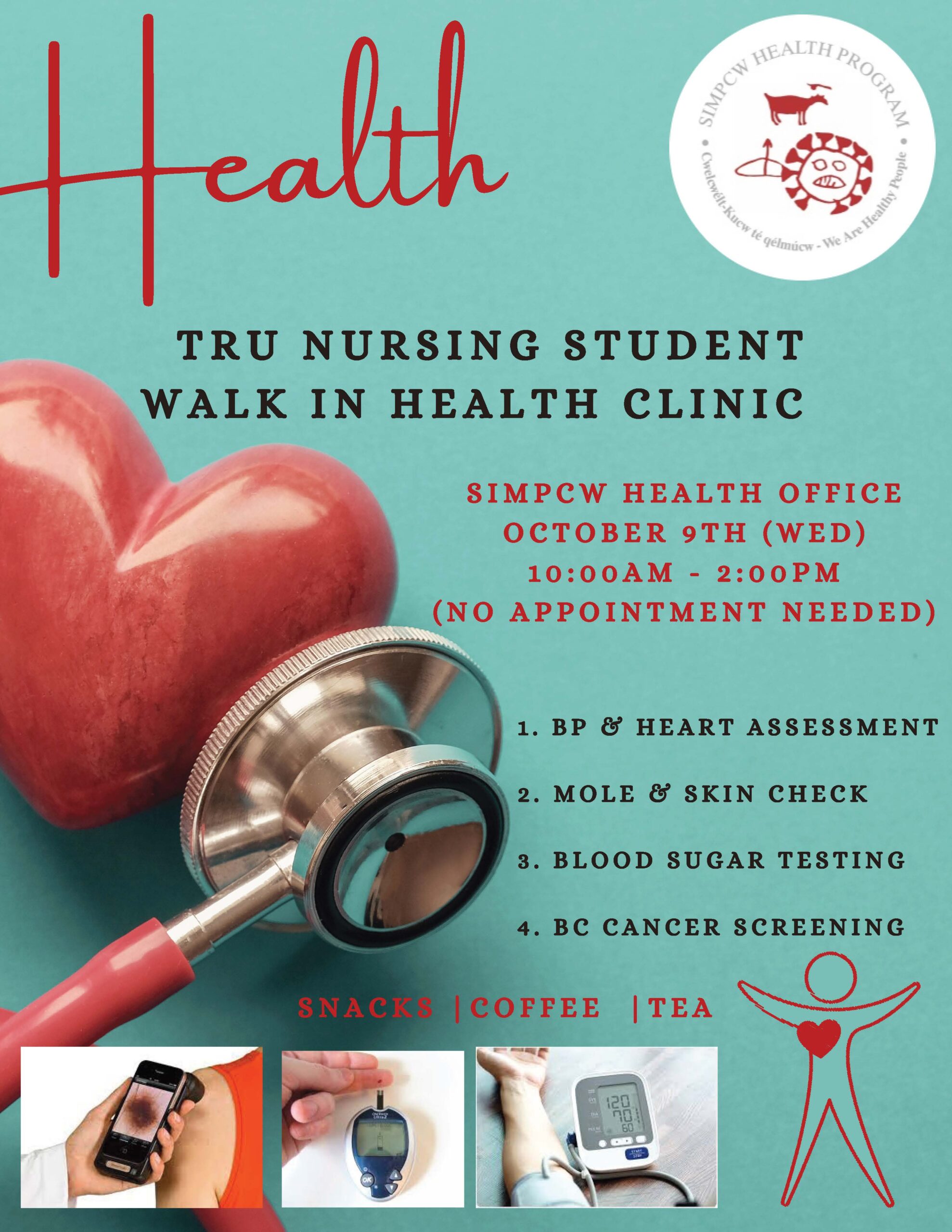 TRU Nursing Student Walk-In Health Clinic October 9th between 10:00am - 2:00pm.    Join us for the opportunity to walk-through 4 stations for a Wellness Check on your Blood Pressure/Heart, Skin, Blood Sugar and BC Cancer Screening.  Snacks, coffee/tea provided!  For Simpcw and adult Community Members only.
